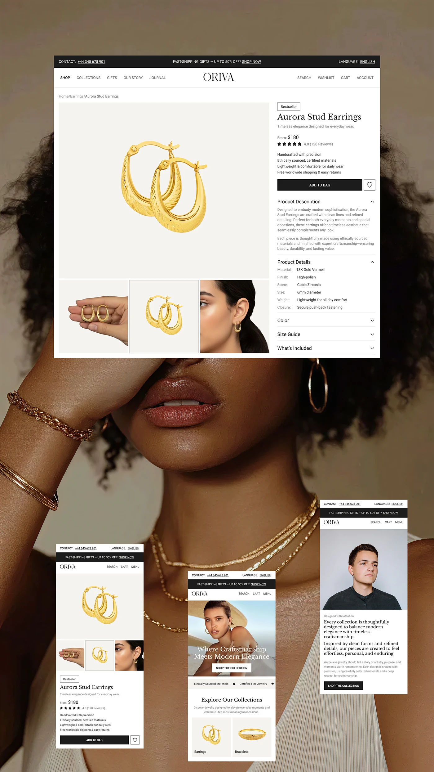 The design language draws from Oriva's jewelry itself — clean lines, generous whitespace, and warm tonal photography that lets the product speak. Product pages were designed with large imagery, detailed specifications, and subtle micro-interactions that create a tactile browsing experience.