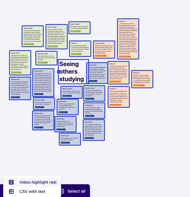 These weren't quick pulse checks. They were long, open conversations — about how people studied, what their days looked like, what brought them to StudyStream and what kept them coming back. Every session was transcribed, tagged, and entered into Dovetail. Then we ran affinity mapping across the full body of interviews, grouping observations until the patterns became impossible to ignore.